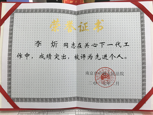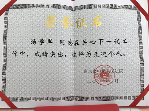 近日,市中院召开“全市法院关工委工作暨表彰会议”,对在关心下一代工作中表现突出的集体和个人予以表彰,栖霞法院关心下一代工作委员会的汤学军同志、李炘同志荣获“先进个人”称号。