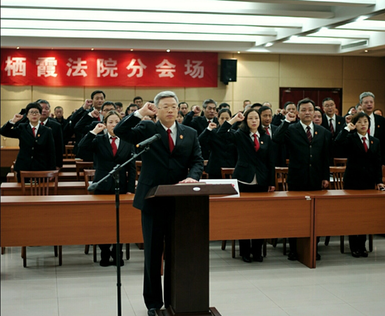 上午10时15分,栖霞法院与上级法院同步开展了宪法宣誓活动。宣誓由院党组书记、院长李传松领誓,伴随着庄严的国歌声,栖霞法院干警身着制服,举起右拳,面向国旗进行了庄重的宪法宣誓。