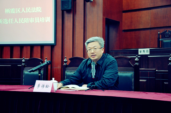 李传松院长向新任人民陪审员介绍了栖霞法院概况,并以人民陪审员制度的起源入手,就如何当好人民陪审员提出几点建议:一是提高思想认识;二是积极依法履职;三是勇于改革创新;四是加强学习培训;五是确保廉洁自律。