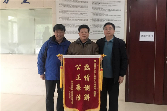 1月16日下午,栖霞法院人民调解员温砚富收到南京君朋物业管理有限公司赠送的锦旗,感谢调解员“热情调解,公正廉洁”。