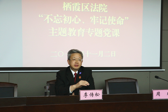 11月2日下午,栖霞区法院党组书记、院长李传松为全院干警讲“主题教育”专题党课。栖霞区主题教育第四巡回指导组成员王凯参加,院党组副书记、副院长周明主持。